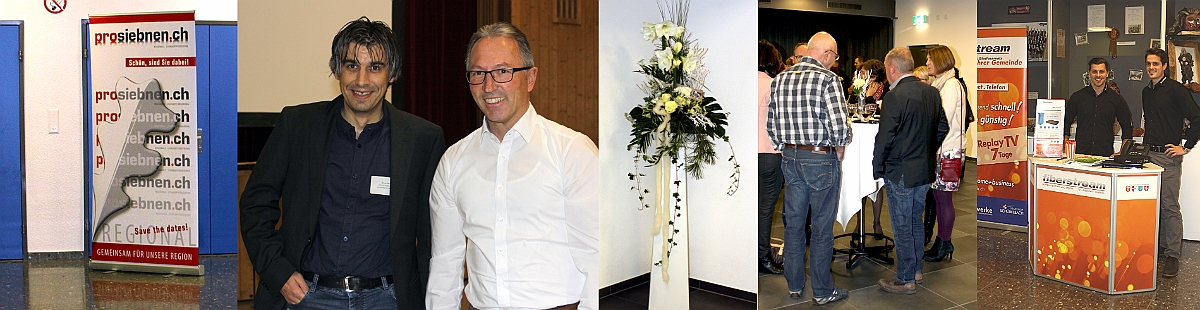 Siebnen_Stockberghalle/Foyer, Business-Apéro 2016, mit Referaten unter dem Motto «Grenzerfahrungen» und Infostand fiberstream - das Glasfasernetz Ihrer Region, Organisator: Gemeinderat Schübelbach